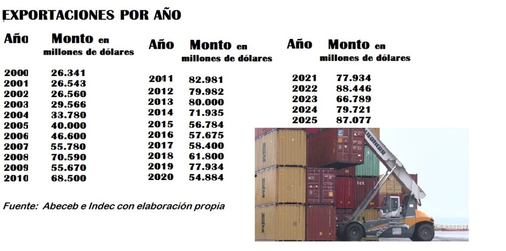 Las exportaciones en 2025 sumaron u$s 87.077 millones, el nivel más alto desde 2022 y el segundo mayor registro histórico desde que existen estadísticas. El balance comercial dio positivo: se exportó por ese monto y se importó por u$s 75.791 millones y quedó un superávit de más de 11 mil millones de dólares