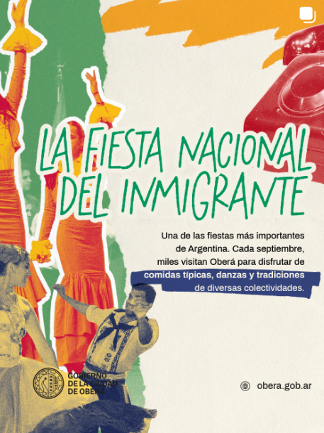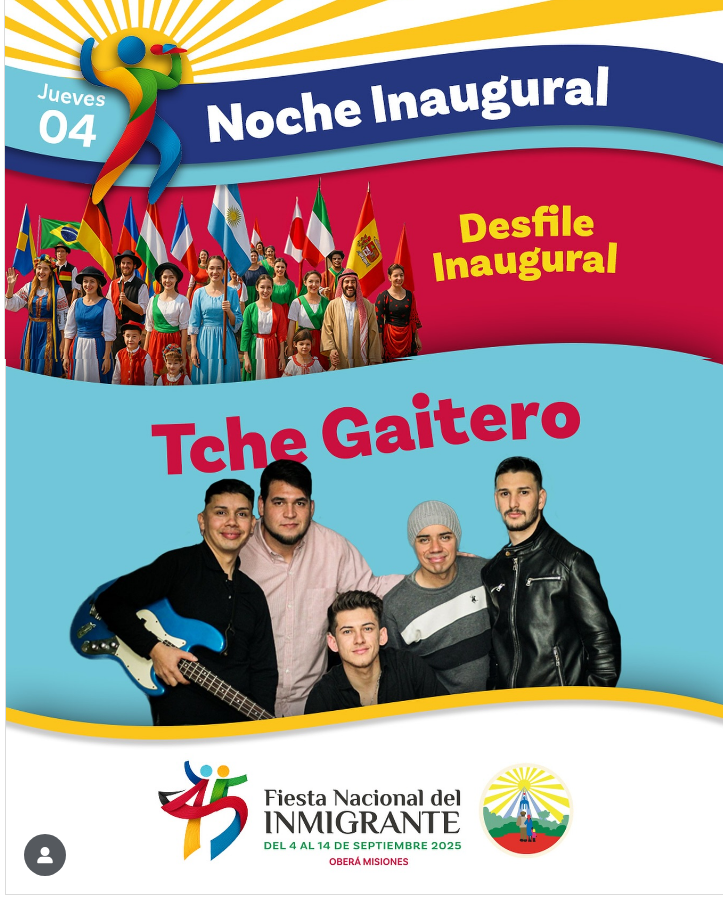 El jueves 4 de septiembre inicia la 45° edición de la Fiesta Nacional del Inmigrante en el Parque de las Naciones de Oberá, el evento popular más importante de la región, con características únicas en el mundo. Durante once días, el Parque de las Naciones recibirá a cientos de artistas, con espectáculos musicales de primera, con los coloridos trajes típicos, con los bailes y danzas tradicionales que inundan el escenario Norguss Jacob, gastronomía de cada región del mundo y noches temáticas.