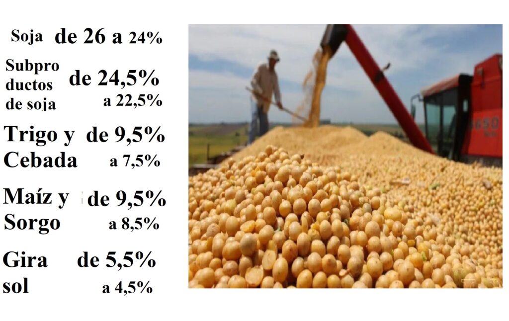 El gobierno nacional anunció una rebaja de entre 1 y 2 puntos porcentuales para las principales exportaciones de granos y subproductos industriales (la harina de soja, por ejemplo). Igualmente, en el caso de la soja siguen constituyendo un cuarto del costo argentino en peso tributario