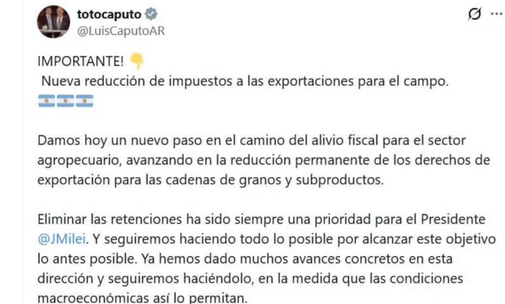 Por lo pronto, Caputo, adelantó el mismo martes que cuando tenga «espacio fiscal» seguirán bajando los derechos de exportación a los distintos granos.