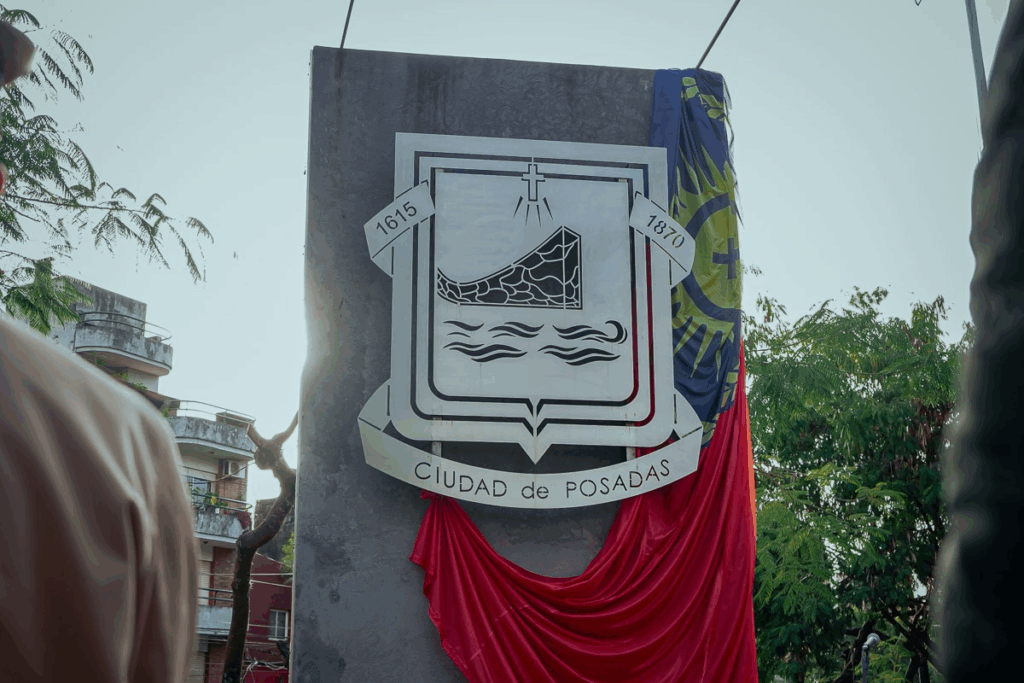 La bandera, cargada de simbolismo, representa distintos aspectos de la identidad local. “Elegimos el color rojo de la tierra colorada, el azul del río Paraná y tiene varios símbolos: los inicios del puerto de Posadas, por eso el ancla; los laureles porque representan la plantación verde; la unión de dos manos entre los pueblos guaraníes y jesuitas”.