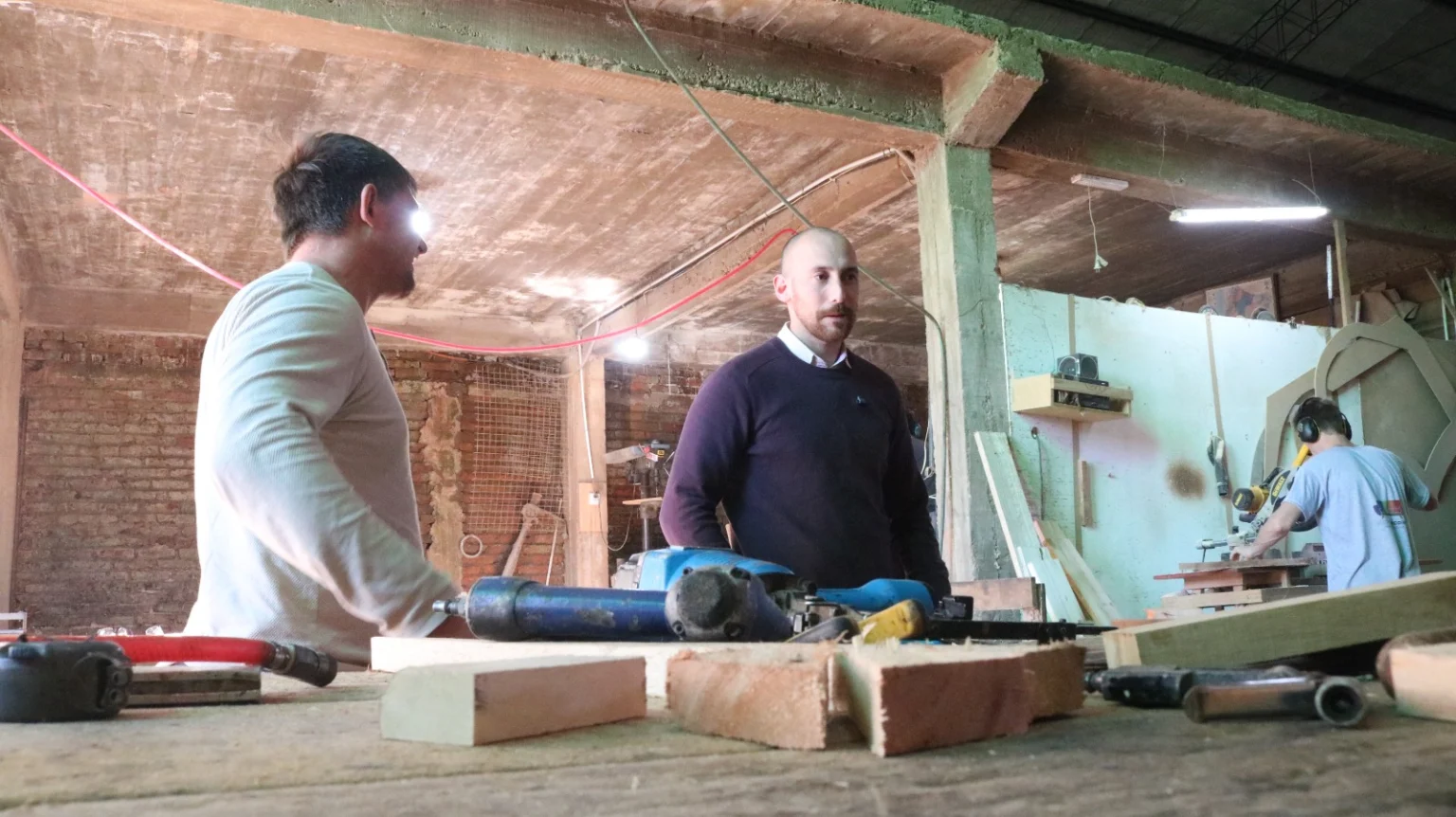 Durante la visita, las autoridades conocieron las diferentes etapas de producción: carpintería, costura, corte de telas y tapicería. Lukaszuk detalló que “el armado del sillón comienza en la carpintería, donde confeccionamos los esqueletos en madera de eucalipto. Luego sumamos cinchas elásticas italianas y telas importadas de China o Brasil, según el modelo. Todo se ensambla y se termina en Misiones, con mano de obra local”.