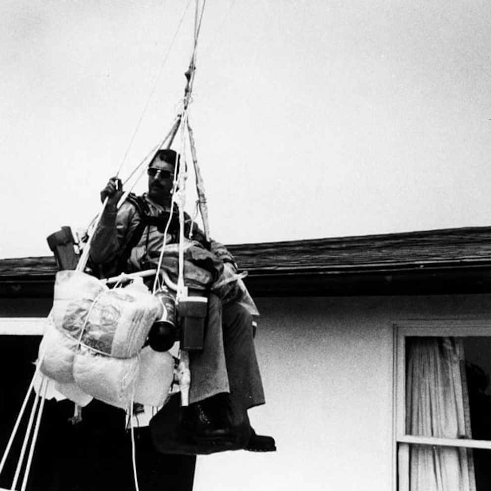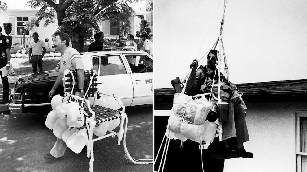 Mientras descendía, Walters utilizó una navaja para cortar las garrafas de agua y regular la velocidad. “Vi el suelo acercándose, a unos 90 metros, y el agua ya se había acabado. Vi los techos y luego los cables eléctricos”, relató.