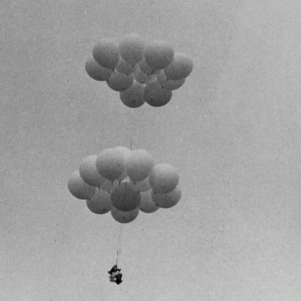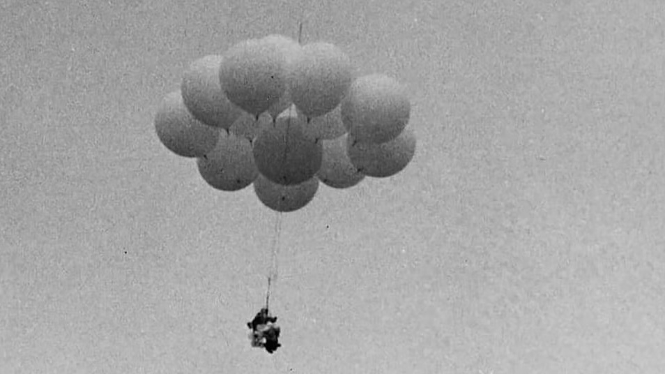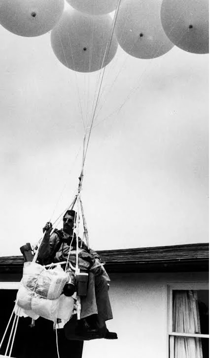 Larry Walters un camionero estadounidense que en julio de 1982 voló a casi 5000 metros de altura sentado en una silla de jardín de aluminio atada a 42 globos de helio. Fue subiendo y subiendo. Tenía la pistola de aire comprimido para disparar a los globos para empezar a bajar…¡pero se le cayó! Al final siguió subiendo hasta que el frío hizo empezó a eliminar el gas y el descenso por suerte fue suave. Todo un recordman
