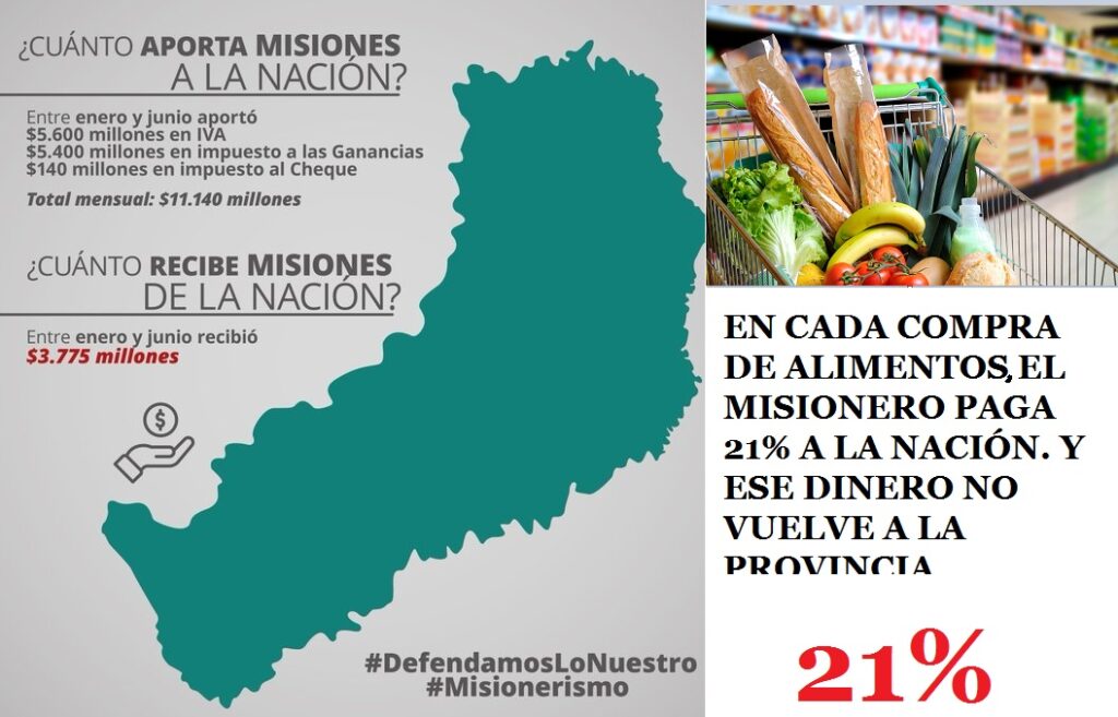 “(…) Entre enero y junio Misiones aportó 5.600 millones de pesos en IVA; 5.400 millones de pesos en Impuesto a las Ganancias y 140 millones de pesos en Impuesto al Cheque (un promedio mensual de 11.140 millones de pesos). Y recibió de enero a junio un promedio de 3.775 millones de pesos”,