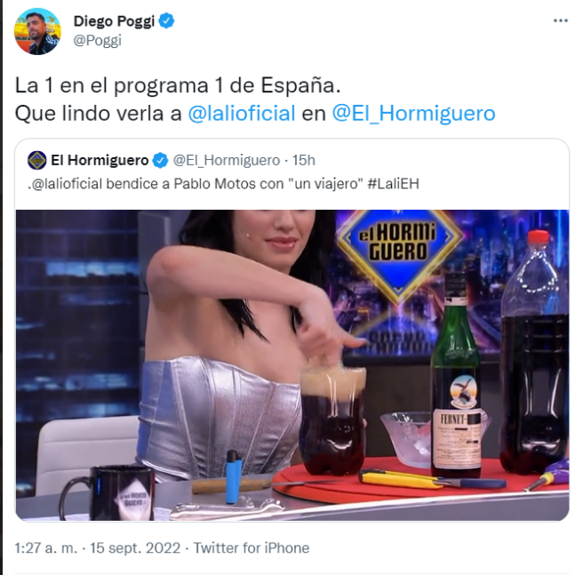 El conductor del programa Pablo Motos, recibió una clase magistral de Lali que revolucionó a todos al enseñar cómo preparar “el viajero” con el fernet y gaseosa, y luego darle de probar a Motos con el objetivo de querer ‘argentinizarlo’ según las propias palabras de la cantante de pop.