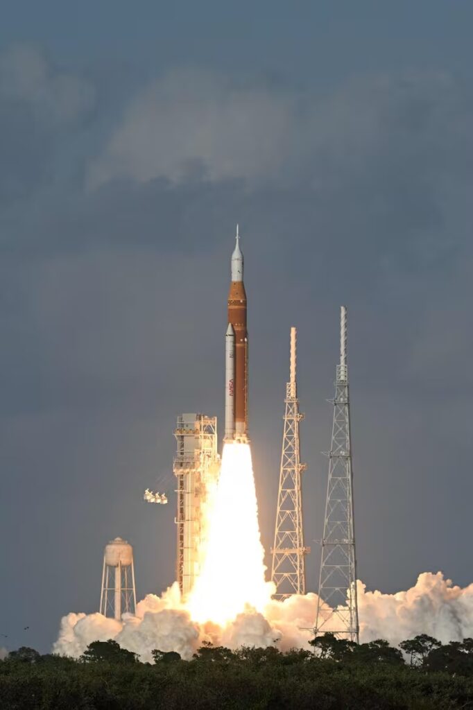 La NASA dirigió el diseño del cohete Space Launch System y de la cápsula Orión, y contrató a las empresas privadas SpaceX y Blue Origin para que proporcionaran los módulos de aterrizaje lunar para las futuras misiones Artemis.