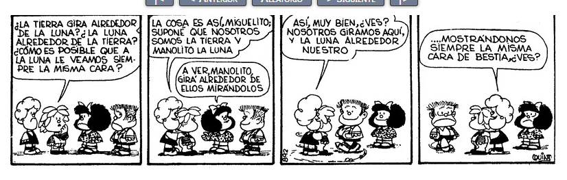 Susanita: La cosa es así, Miguelito, suponé que nosotros somos la Tierra y Manolito la Luna.