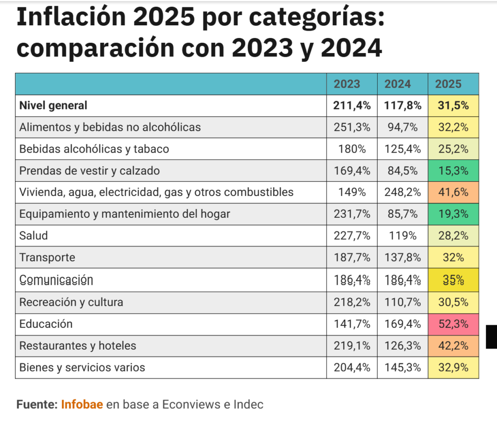 Dentro de ese escenario, se pueden reconocer también puntos altos y bajos en la segmentación por rubros. Fácilmente se identifican tres ítems que subieron por encima del IPC general y empujaron el promedio hacia arriba. Lo que más subió en 2025 fue la “educación”, con una variación del 52,3% en el total del año. Le siguieron “restaurantes y hoteles” (42,2%) y el segmento de “vivienda, agua, electricidad, gas y otros combustibles” (41,6%). En ese último punto es donde están incluidas las tarifas de los servicios públicos, que no solo ocuparon el podio de aumentos en 2025, sino que además empezaron el 2026 con nuevos ajustes programados.