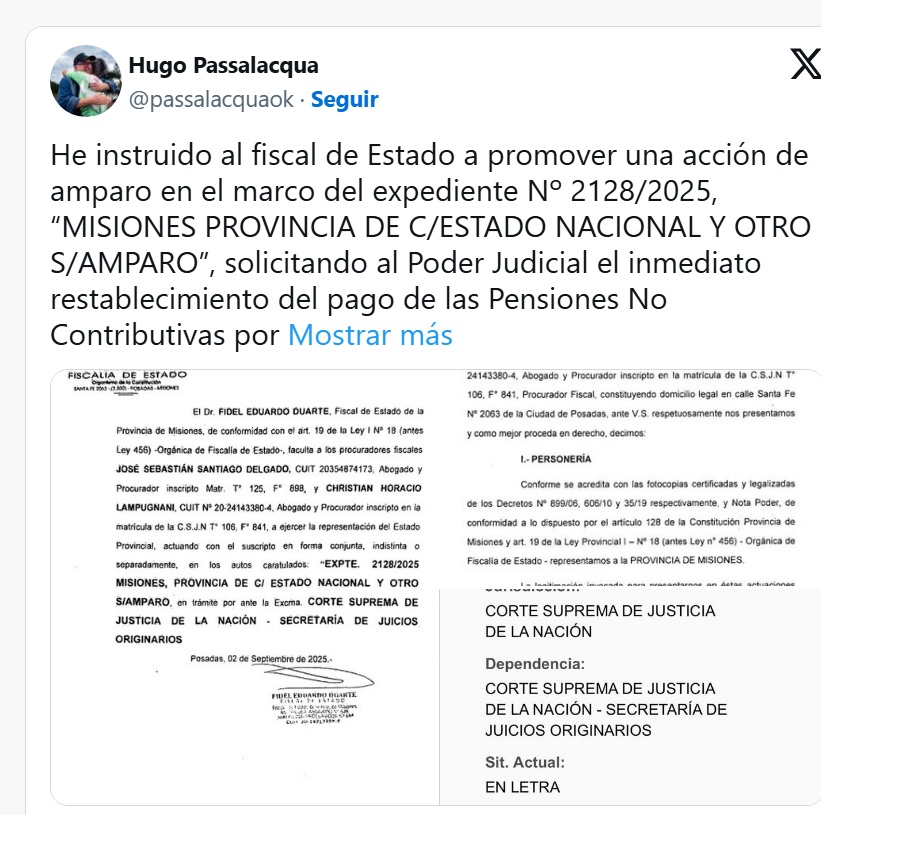 La demanda, caratulada “Misiones provincia de C/Estado nacional y otro S/Amparo” , ya fue ingresada en la Secretaría de Juicios Originarios del máximo tribunal bajo el número de expediente 2128/2025. La presentación busca dar una respuesta a la “suspensión ilegítima” de las prestaciones que afecta a miles de misioneros.