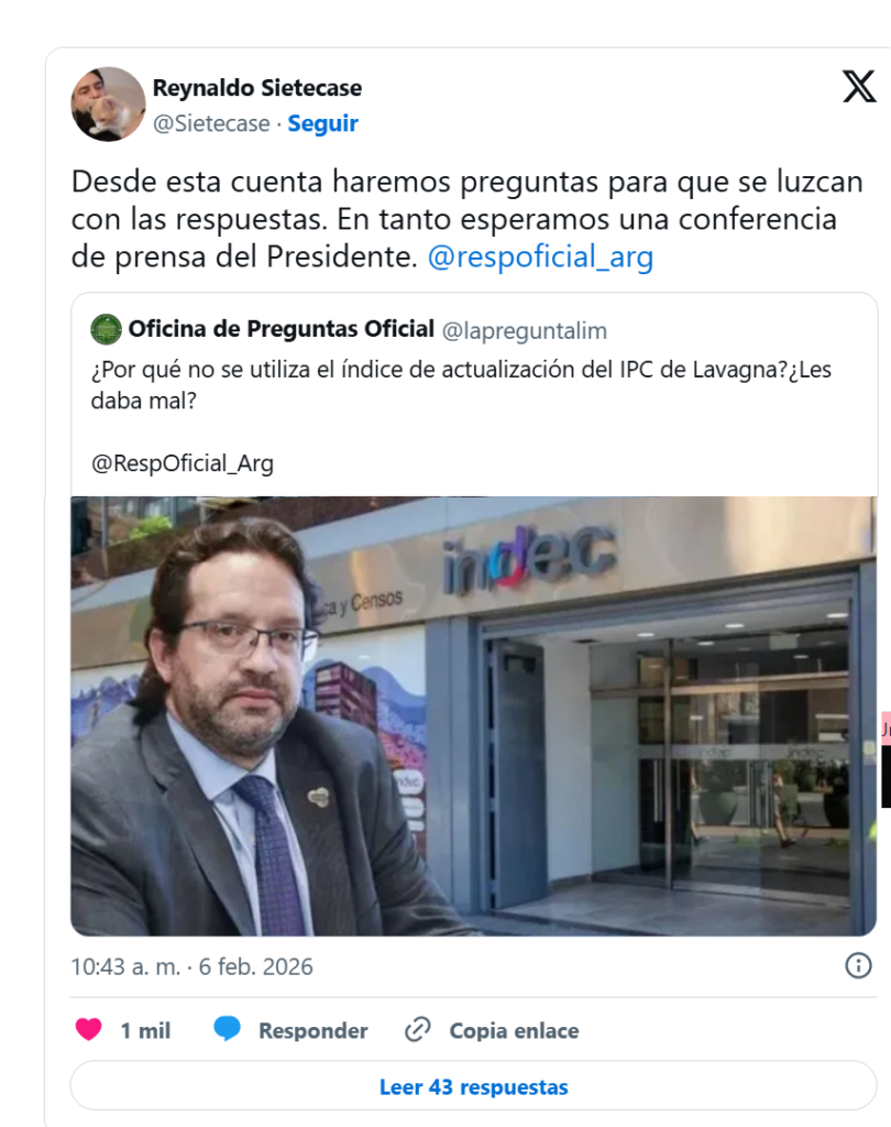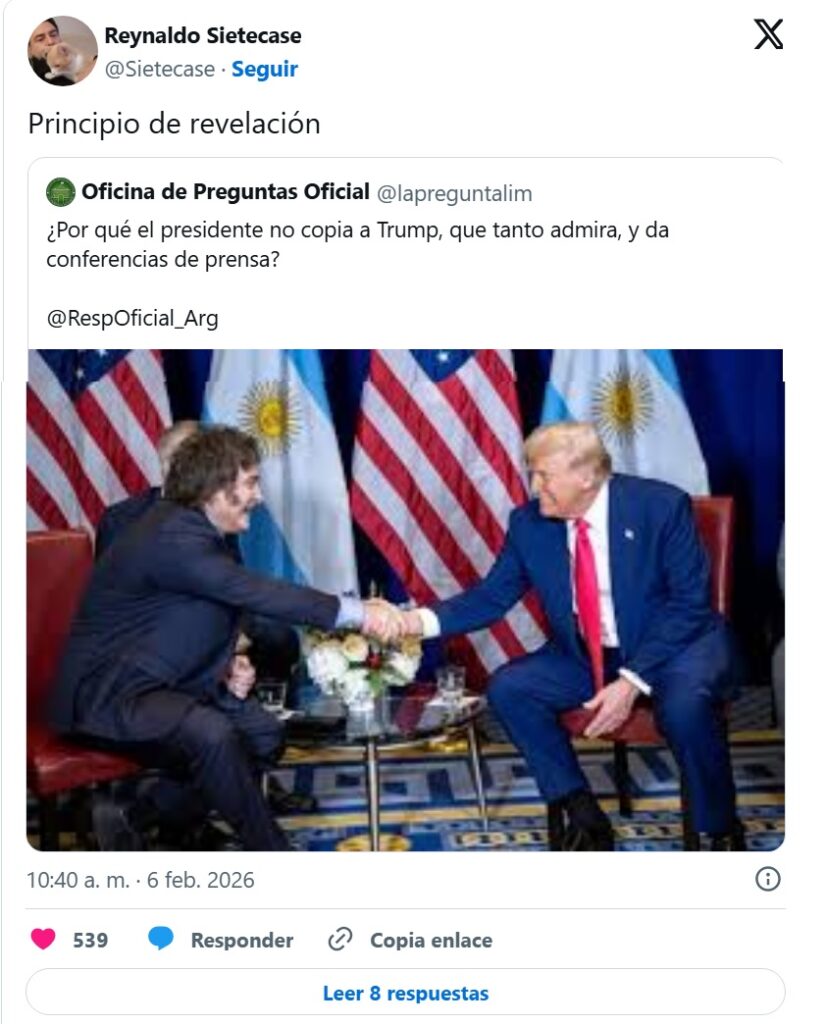 El periodista Reynaldo Sietecase lanzó una cuenta de X «para realizar preguntas» a la reciente estructura oficina celebrada por Javier Milei. El Gobierno insiste en solo salir a desmentir. Pero no quiere dar conferencias de prensa, algo absolutamente normal en las democracias. Pero no lo hace. Tampoco lo hicieron Alberto Fernández ni Cristina Fernández con anterioridad