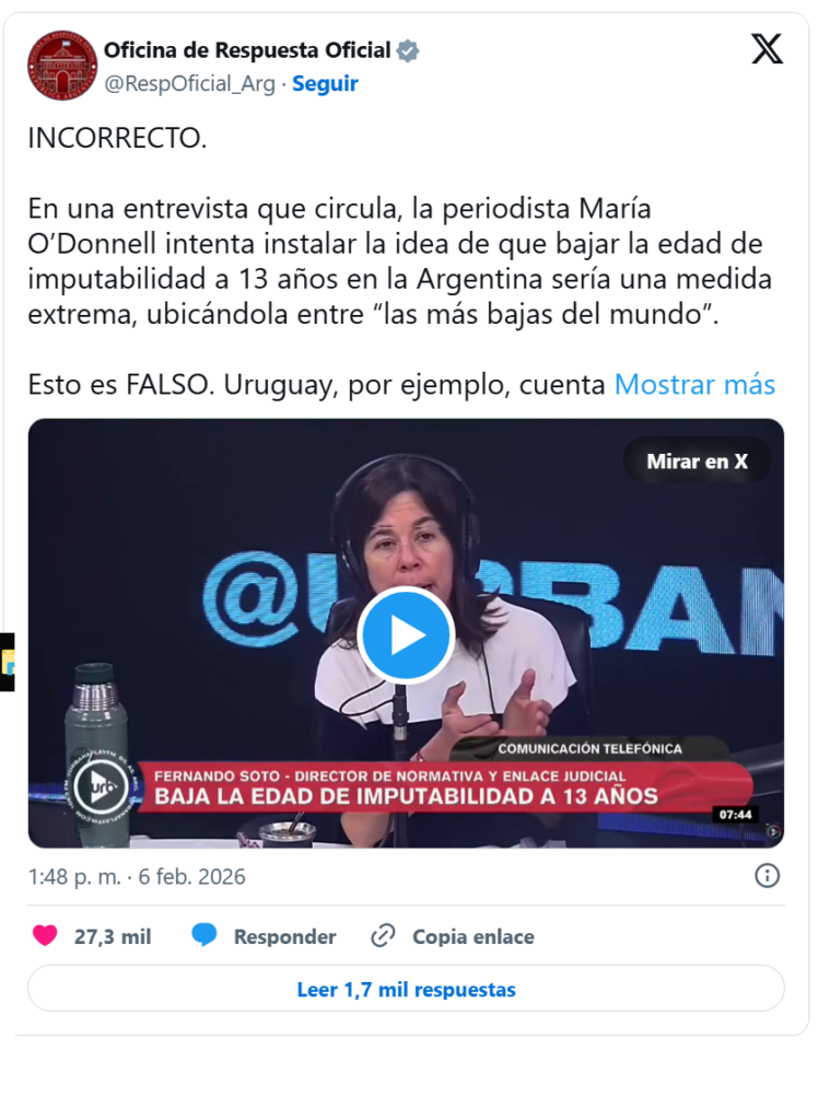 Una cuarta acusación llegó contra la periodista María O’Donnell, que había afirmado que bajar la edad de imputabilidad a 13 años sería “de las más baja del mundo”. “Esto es FALSO. Uruguay, por ejemplo, cuenta desde 2004 con un sistema que permite juzgar y condenar a menores de entre 13 y 17 años. Fuera de Sudamérica, muchos otros países tienen la edad mínima de imputabilidad fijada por debajo de los 16 años: Inglaterra y Gales (10 años), Canadá, Irlanda, los Países Bajos, Grecia y Escocia (12 años), y Francia, Polonia y Rumania (13 años)”, argumentó la cuenta de X.