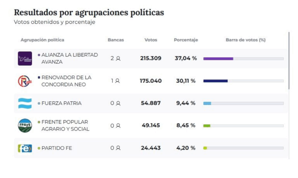 La Libertad Avanza (LLA) obtuvo el 40% de los votos en todo el país, se impuso en 16 de las 24 jurisdicciones y reforzó su liderazgo en los principales centros urbanos del país. También ganó en Misiones. Tendrá alrededor de 100 diputados en la Cámara. Impactó el triunfo en provincia de Buenos Aires donde había perdido por 13 puntos hacía 50 días. El peronismo-kirchnerismo llegó al 31%. Hubo baja participación de los votantes.