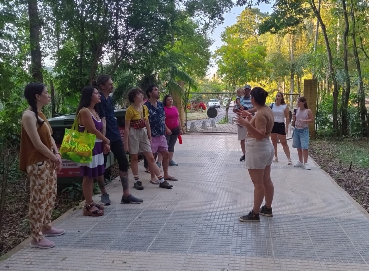 Con curiosidad en sus miradas el atento conjunto compuesto por turistas de Misiones y de Río Negro más vecinos de la ciudad siguió las explicaciones de la guía Thelma Portillo que comenzaron en el sector del Salón de Usos Múltiples, ubicado junto a la plaza de juegos infantiles, tras una breve introducción, la delegación se dirigió al ingreso al parque donde se dio lugar específicamente al paseo de reconocimiento de fauna y flora.