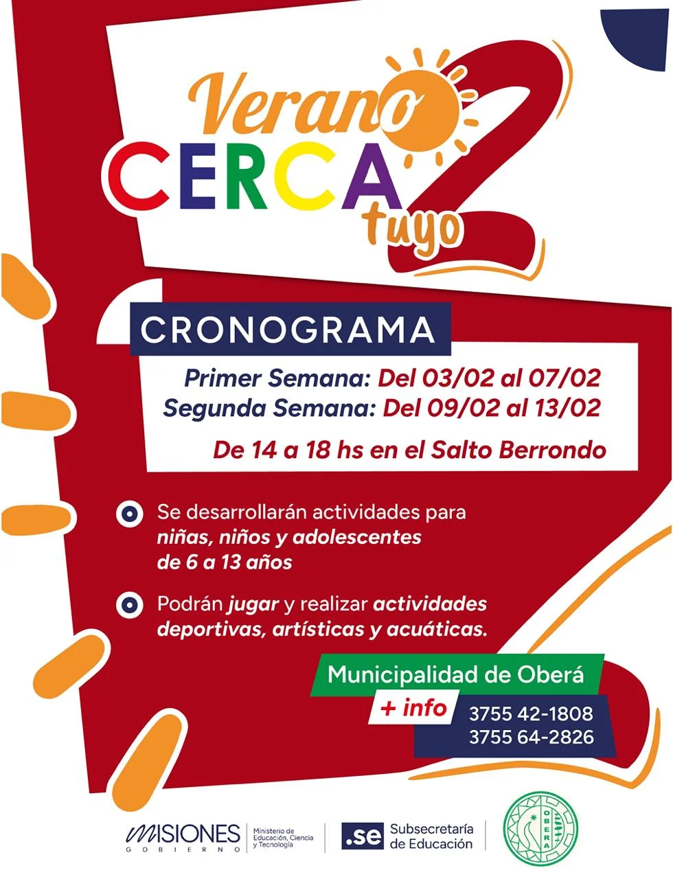 El Estado provincial, junto a los municipios, impulsa el programa Verano Cerca Tuyo II 2026, una propuesta educativa, cultural y recreativa. En Oberá se desarrollará del 2 al 13 de febrero. Las inscripciones se extienden hasta el día martes 3 de febrero.