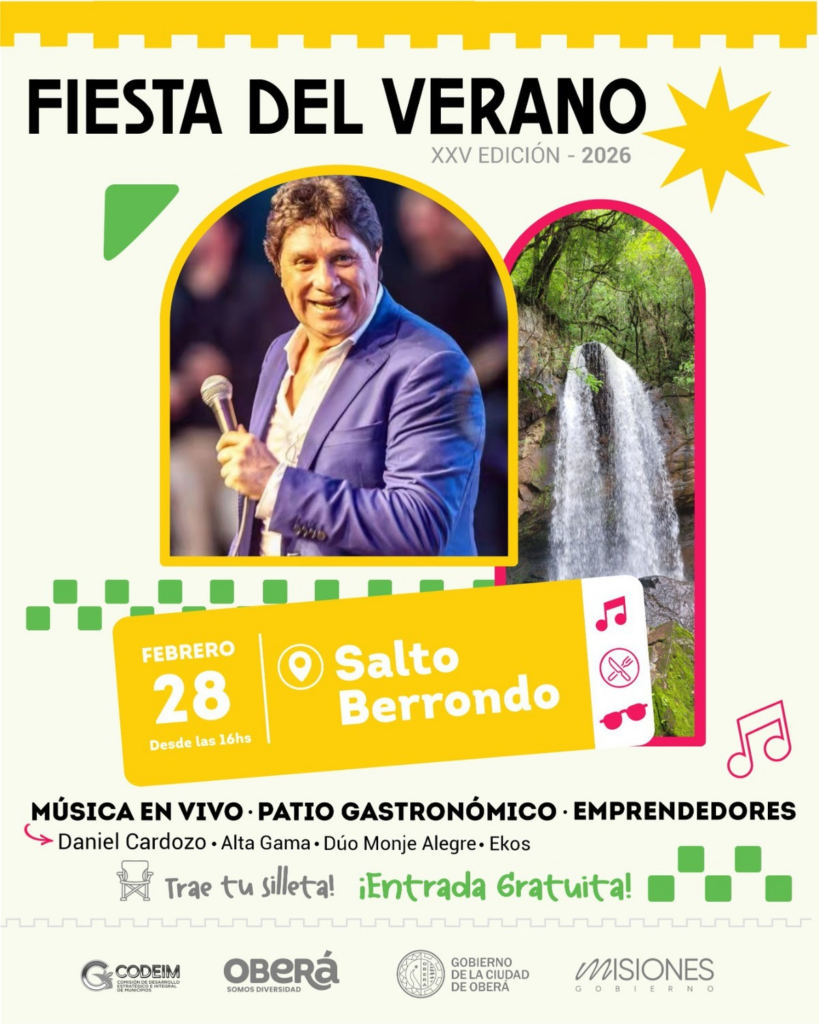 La Fiesta del Verano contará con entrada gratuita a partir de las 14 horas en el Complejo Turístico Salto Berrondo, donde se ofrecerá una jornada para disfrutar en familia, con música en vivo, actividades recreativas y la esperada definición del Campeonato Mejor Asador.
