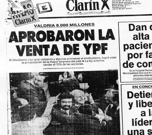 En los años 90 del siglo pasado el presidente Carlos Menem decidió privatizar YPF. Para el matrimonio Kirchner que gobernaba Santa Cruz era la acción del gran presidente argentino y se estima que fueron 650 millones de dólares a las arcas provinciales. En 1993, la española Repsol se quedó con YPF.